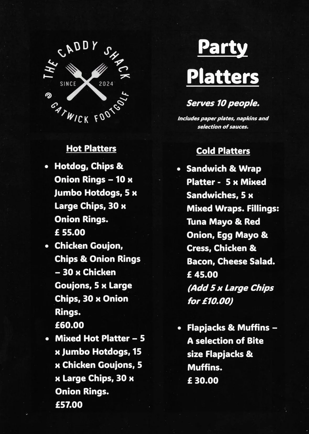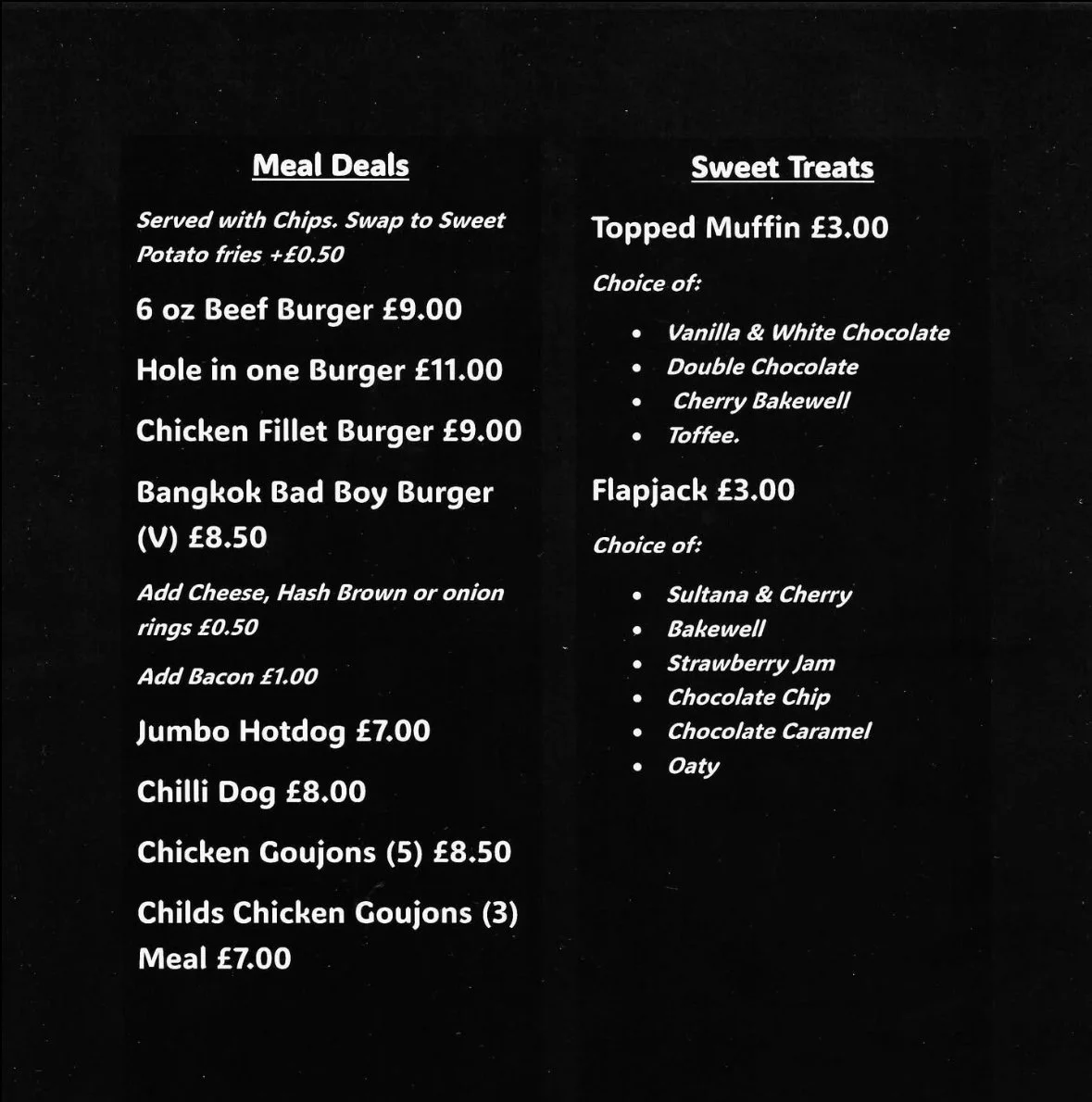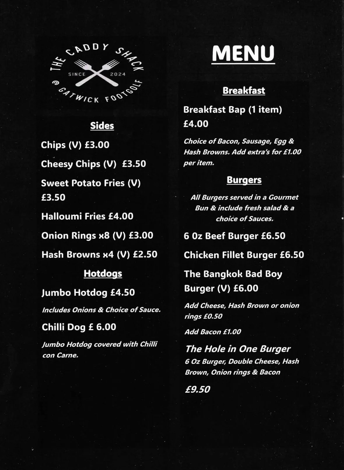 In addition to the scrummy snacks offered in our clubhouse we are lucky enough to have an amazing food truck with us on site, run by the outstanding team at The Caddy Shack! They have a wide range of hot food to keep all our customers well fed all year round, take a look at their menu below and find out more about what they offer by clicking here to their Facebook page.